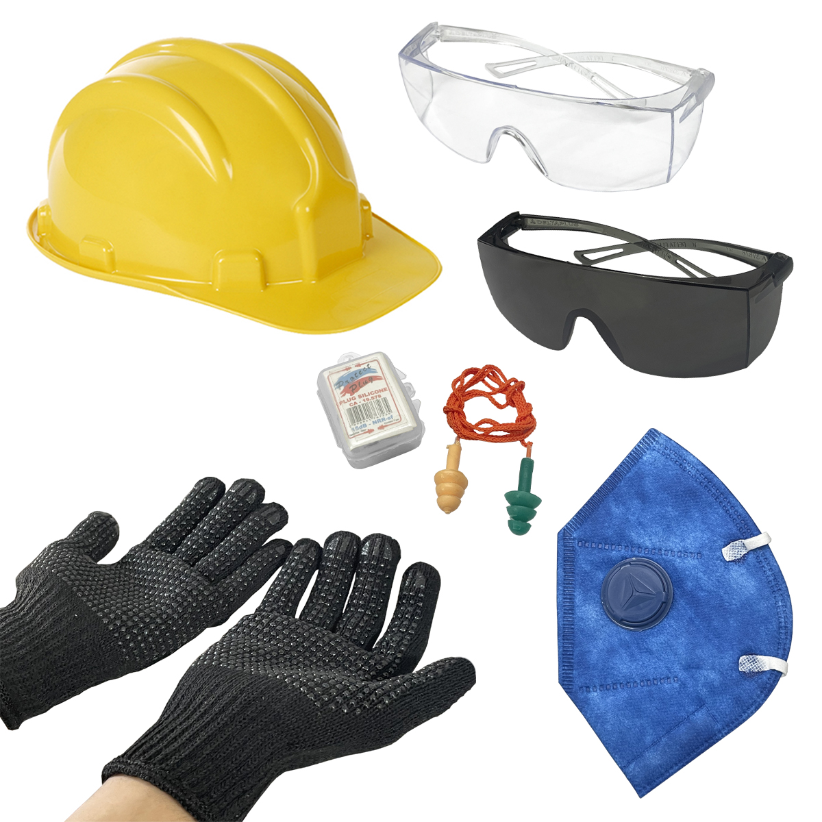 Com o Kit de EPI Para Obras Amarelo você trabalha com conforto e segurança. O kit contém: 1 Capacete de segurança Amarelo, 2 Óculos de proteção (Fumê/Incolor) 1 Protetor Auricular, 1 Par de Luvas Pigmentada e 1 respirador PFF2.